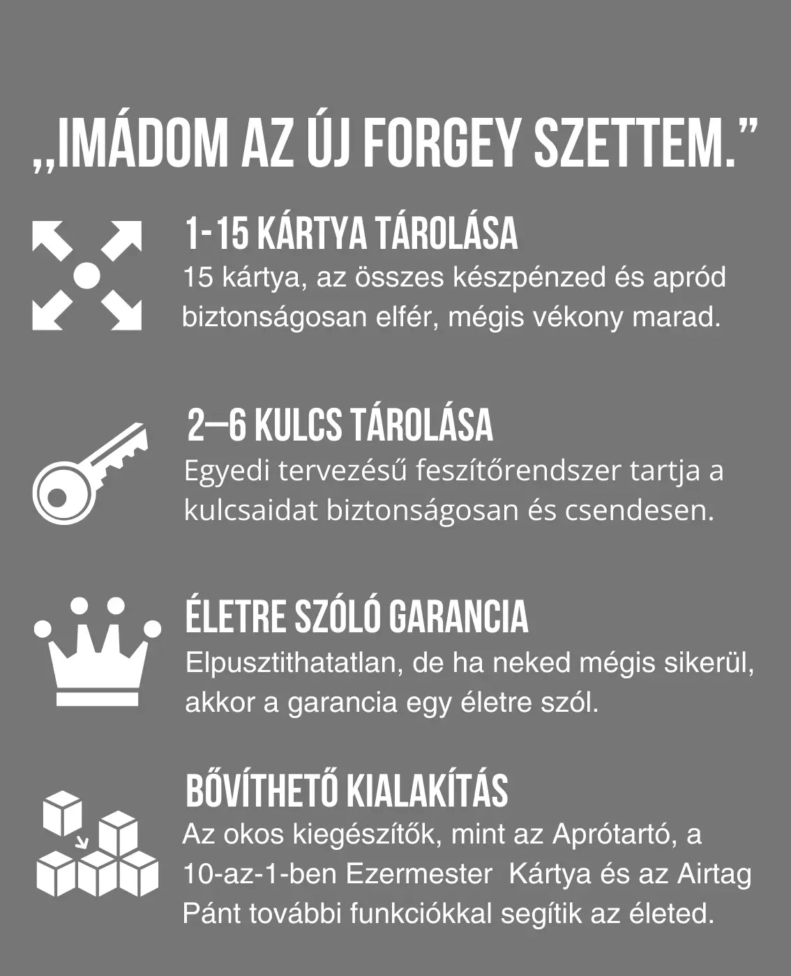 A Forgey pénztárcában maximum 12-15 darab kártya kényelmesen elfér, ezen felül a készpénzed is. Ez 20-ig bővíthető, ha szükséges.