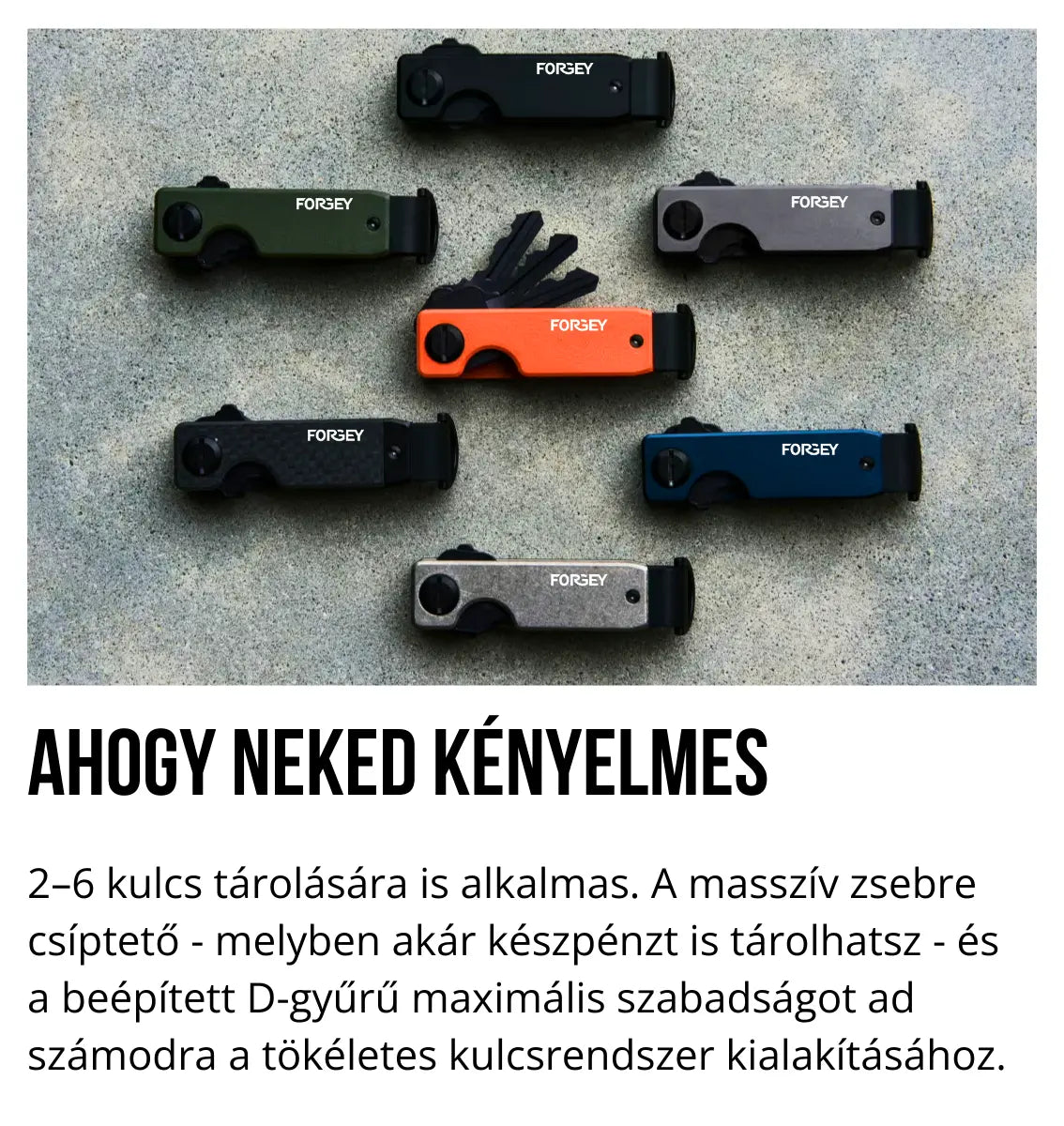 A Forgey Kulcstartóban 5-6 kulcs fér el. (maximum 6 cm hosszú) A plusz karikára további kulcsokat is lehet tenni, mint például a kocsikulcsot vagy pince és lakat kulcsokat. 10 kulcsnál többet nem ajánlott egy Forgey Kulcscsomón tartani.