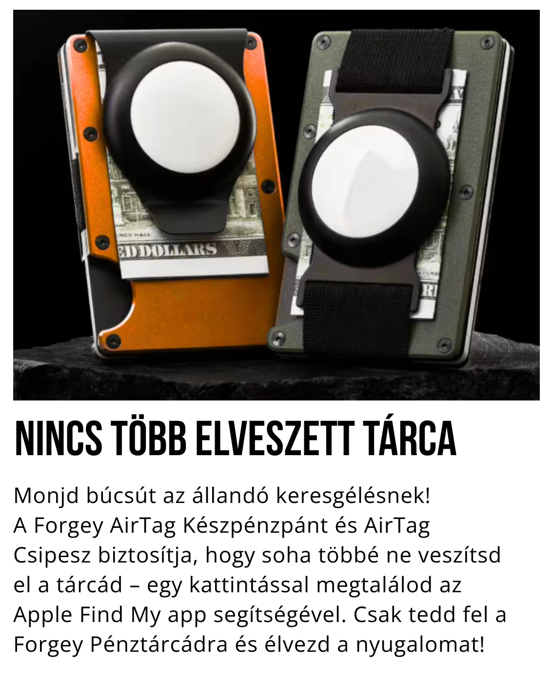 Okosítsd fel a Forgey Pénztárcád! A Forgey AirTag  Készpénzpánt és Airtag Csipesz biztosítja, hogy soha többé ne veszítsd el a tárcád – csak helyezd bele az Airtaged vagy a Forgey Nyomkövetőt és egy kattintással megtalálod az Apple Find My app segítségével.