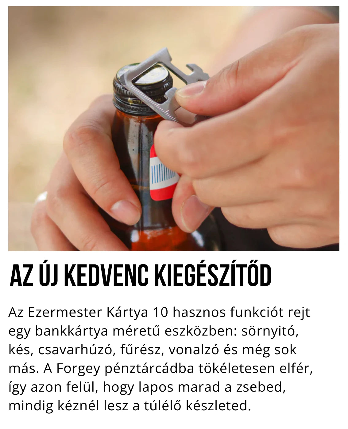 Az Ezermester Kártya tökéletes kiegészítője a Forgey Pénztárcádnak. Ez a bankkártya méretű okos eszköz 10 funkciót rejt: sörnyitó, csavarhúzó, imbuszkulcs, fűrész, kés, vonalzó, konzervnyitó és még több apró segítség. Elfér a tárcádban, így mindig kéznél van, ha hirtelen szükség lenne egy szerszámra.