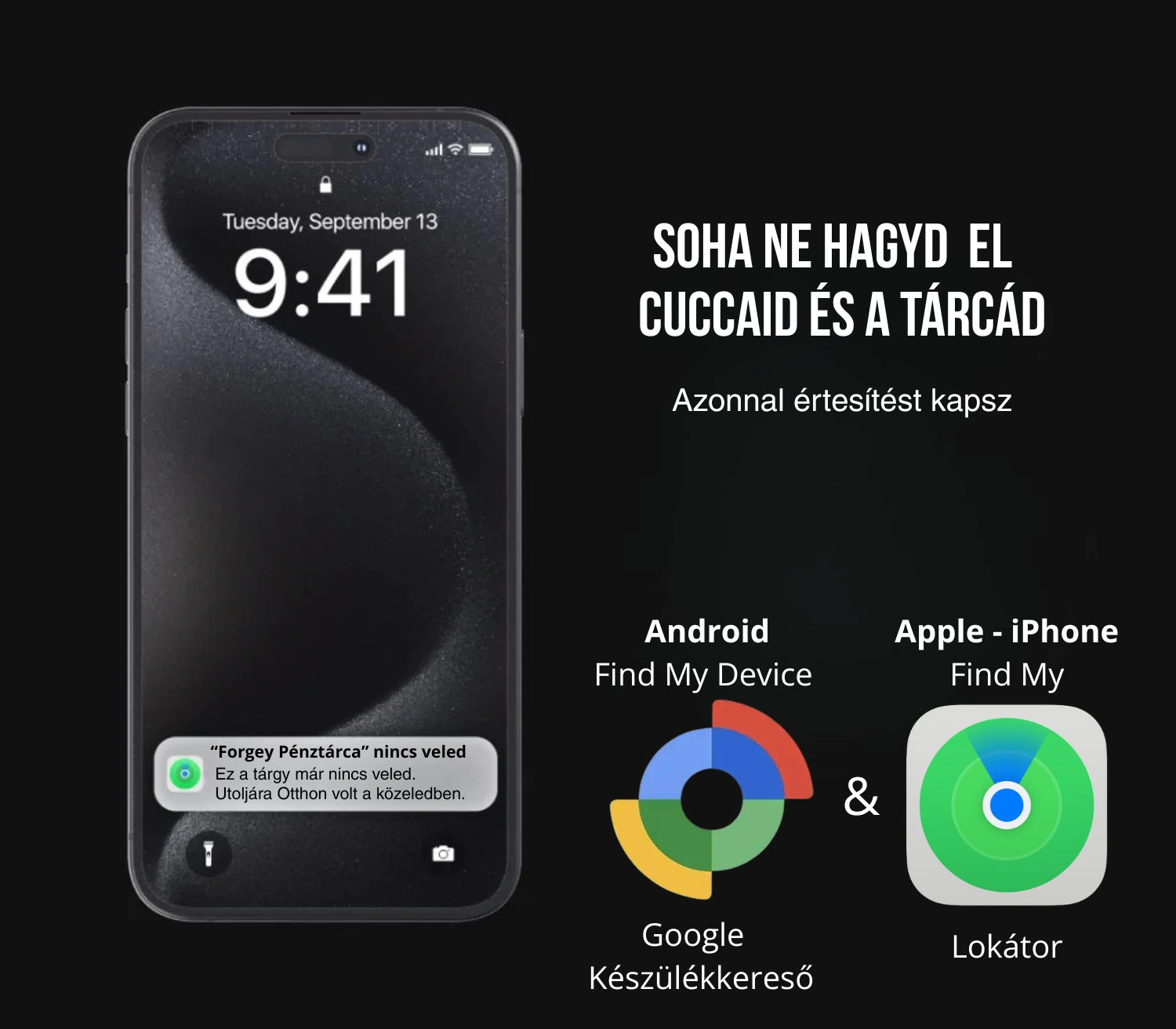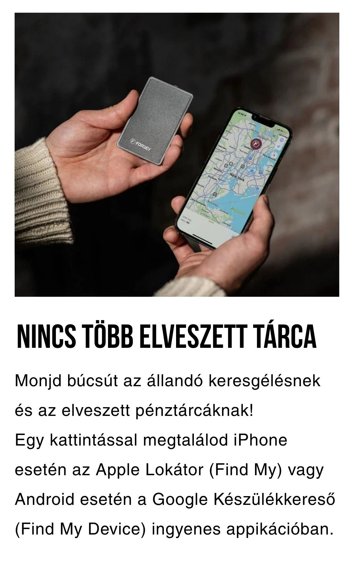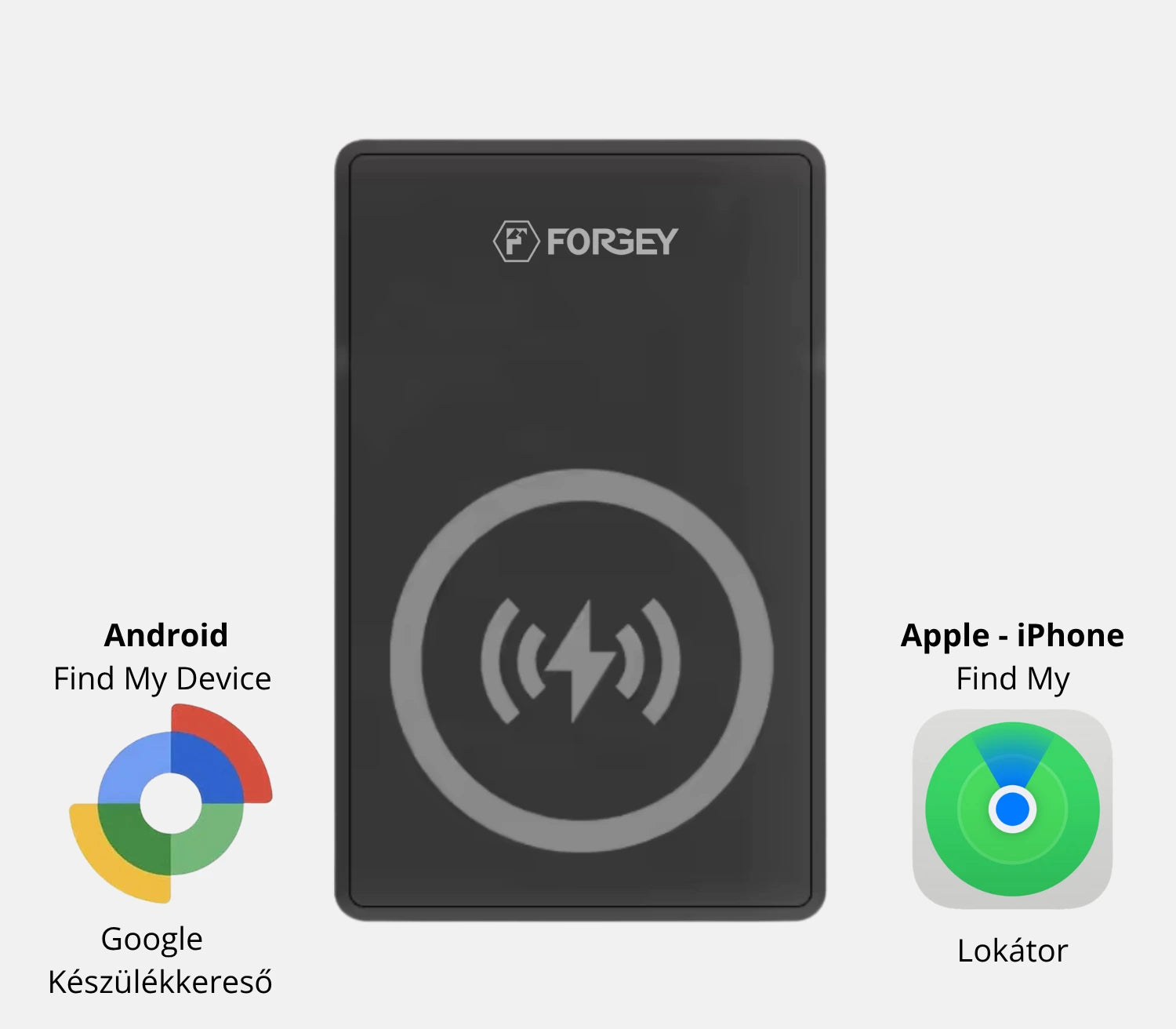 A Forgey GPS Nyomkövető Kártya tökéletesen működik iPhone és Android készülékekkel is. Használhatod az ingyenes Apple Lokátor (Find My) vagy a Google Készülékkereső (Find My Device) alkalmazással, így bárhol könnyen megtalálhatod a pénztárcádat, táskád vagy az autód parkoló helyét.