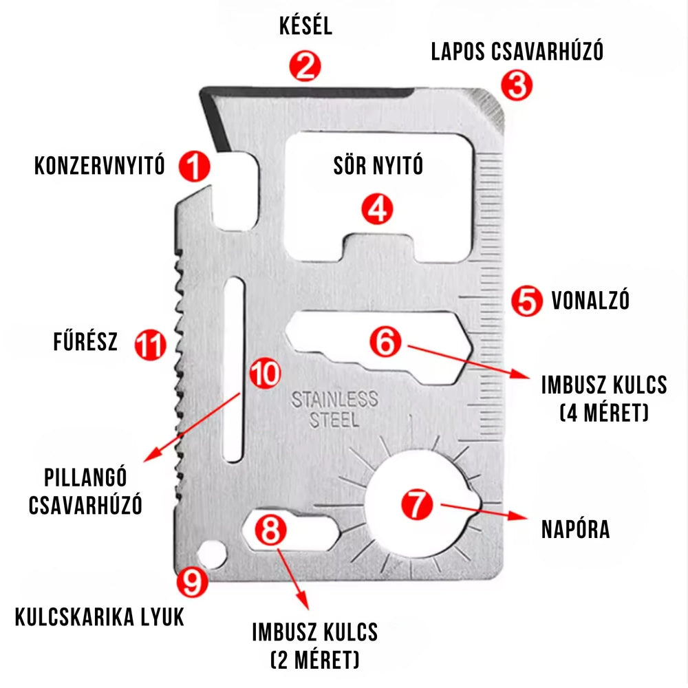 Az ezermester kártya rozsdamentes acélból készül, amely ellenáll a mindennapi használatnak. A felület az évek múltával enyhe nyomokat idővel felvehet, de ez a természetes kopás része.